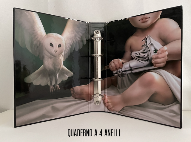 Quaderno ad anelli by Shareprinting di TIPO 6: esterno lo Stemma Malfoy in b/w, interno con un giovane Malfoy, Sneaky e il barbagianni ~ Realizzato in cartoncino rigido lucido, formato A5, made in Italy * Disponibile a 4 anelli (barra in metallo, colore argento) e a 6 anelli (barra in metallo, colore nero) * Dimensioni esterne: altezza 25 cm, profondità 19 cm, spessore/dorso 4,5 cm ~ Diametro interno degli anelli: 3 cm * Fai attenzione a scegliere il Liber cartaceo e il quaderno con la stessa foratura, da 4 o da 6 anelli * Puoi prendere il quaderno da solo (18€) oppure abbinarlo alla sua custodia in cartoncino (anche lei da 18€, prezzo finale 36€) * Disegno esterno by Nell Fallcard, www.nell-f.com